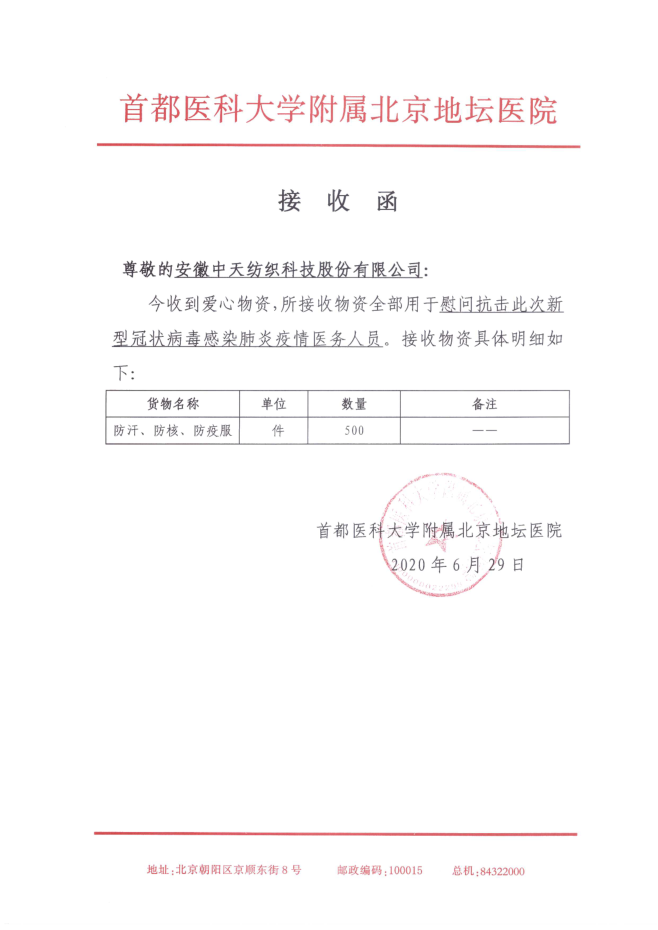 自6月11日,北京突發(fā)疫情反彈進(jìn)入防疫戰(zhàn)時(shí)狀態(tài)后,安徽中天紡織科技股份有限公司向首都醫(yī)科大學(xué)附屬北京地壇醫(yī)院捐贈(zèng)了500件防汗、防核、防疫服,用于慰問抗擊此次新型冠狀病毒肺炎疫情的醫(yī)務(wù)人員。首都醫(yī)科大學(xué)附屬北京地壇醫(yī)院作為北京目前獨(dú)家承擔(dān)收治任務(wù)的醫(yī)院,各部門有序應(yīng)對(duì),再一次體現(xiàn)了地壇速度。